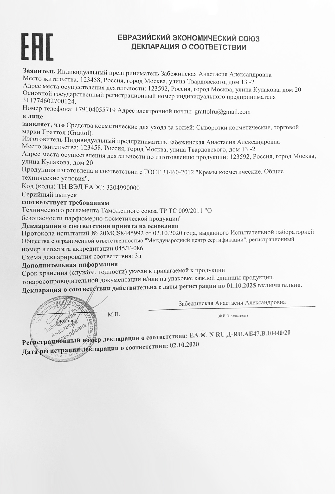 | Наименование товара Grattol™ | Номер декларации | Срок действия декларации |