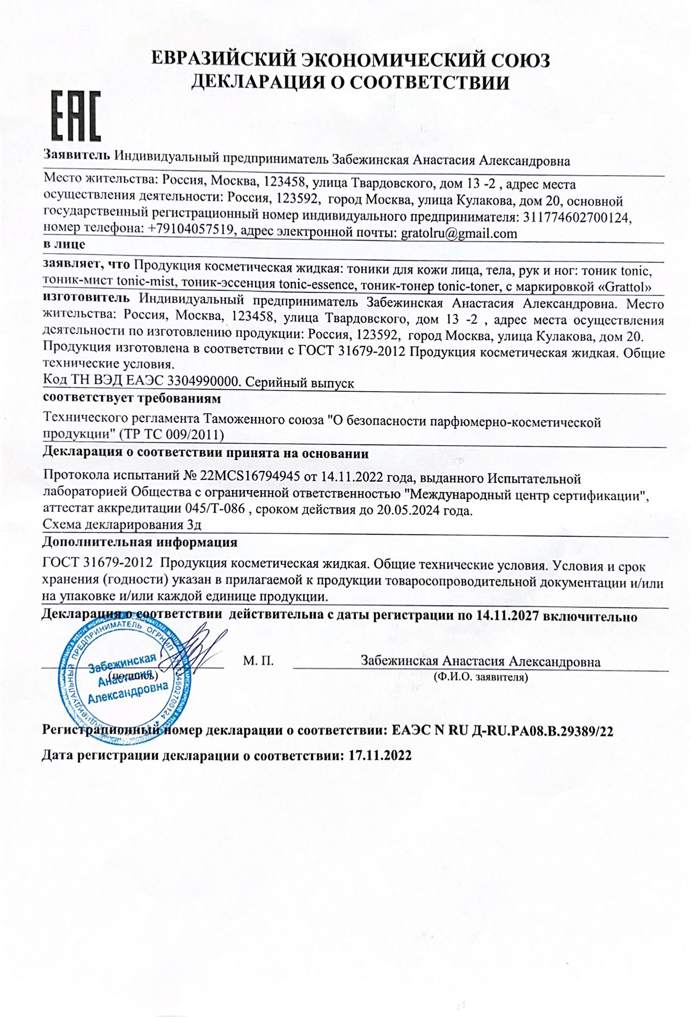 | Тоник для тела | ЕАЭС N RU Д-RU.РА08.В.29389/22 | 14.11.2027 |