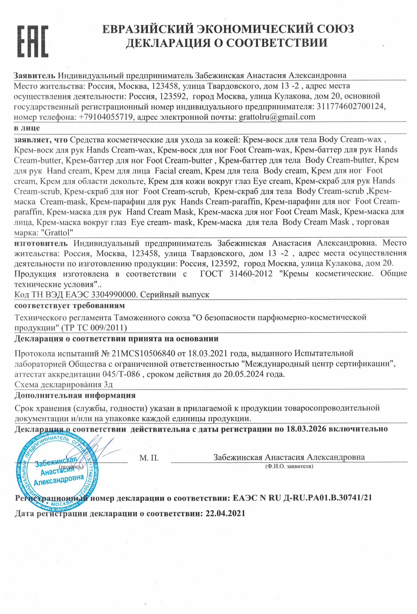 | Крем-парафин | ЕАЭС N RU Д-RU.РА01.В.30741/21 | 18.03.2026 |