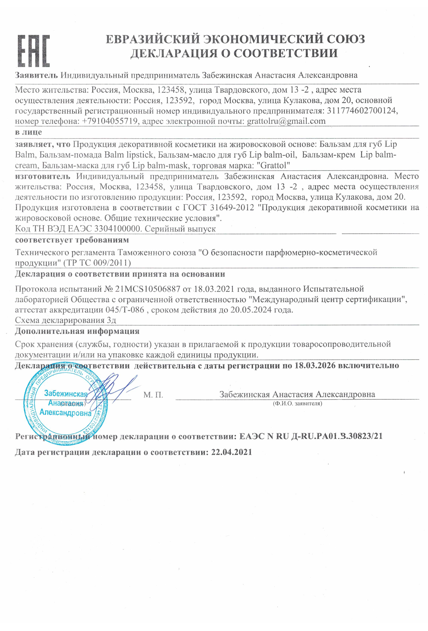 | Бальзамы для губ | ЕАЭС N RU Д-RU.РА01.В.30823/21 | 18.03.2026 |