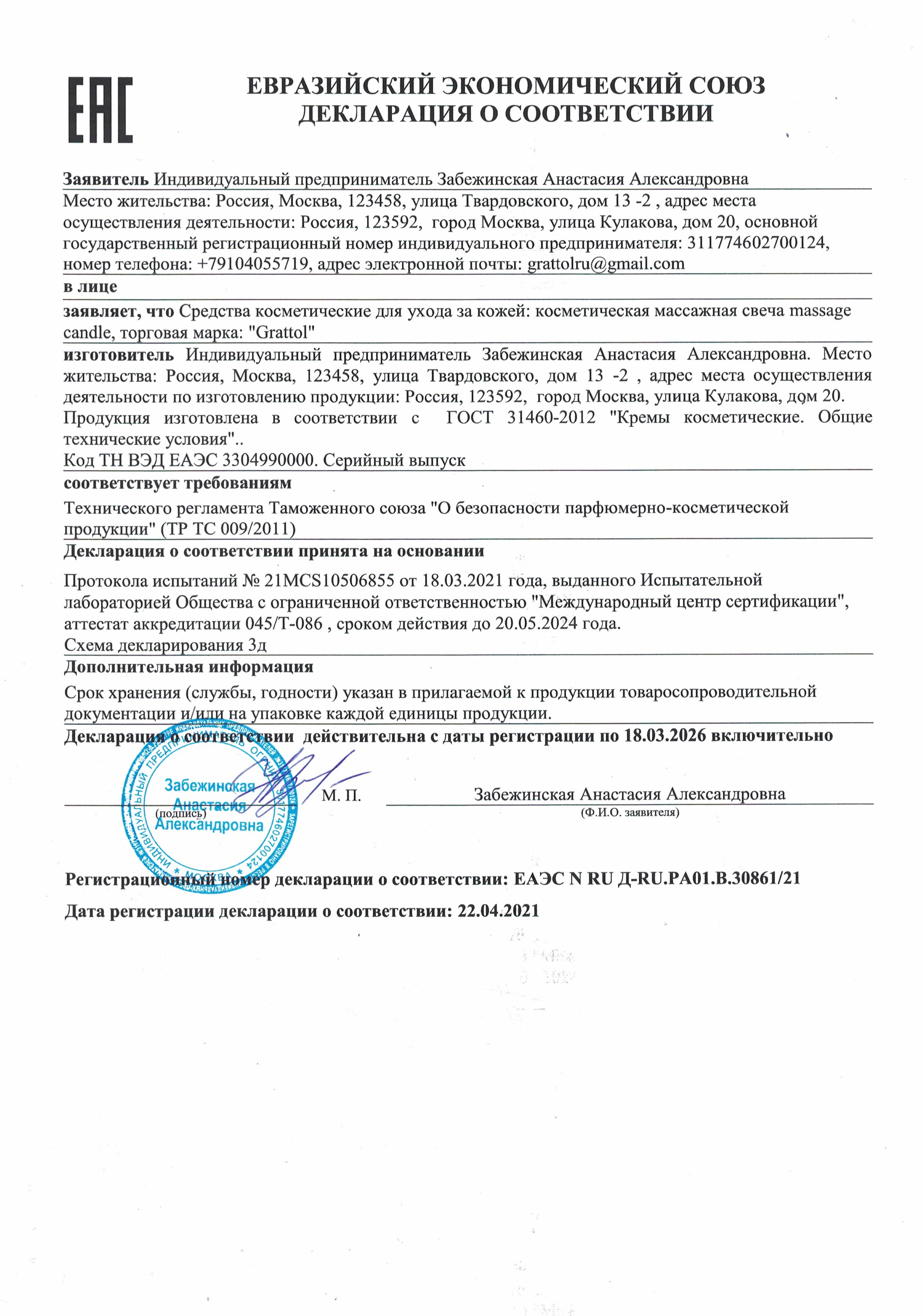 | Массажные свечи | ЕАЭС N RU Д-RU.РА01.В.30861/21 | 18.03.2026 |