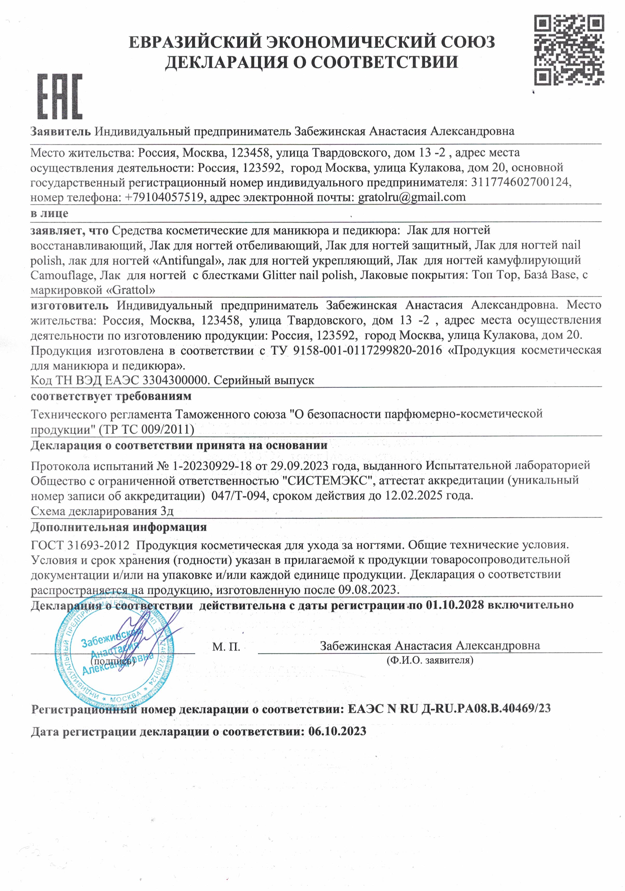 | Топ для лака | ЕАЭС N RU Д-RU.РА08.В.40469/23 | 01.10.2028 |