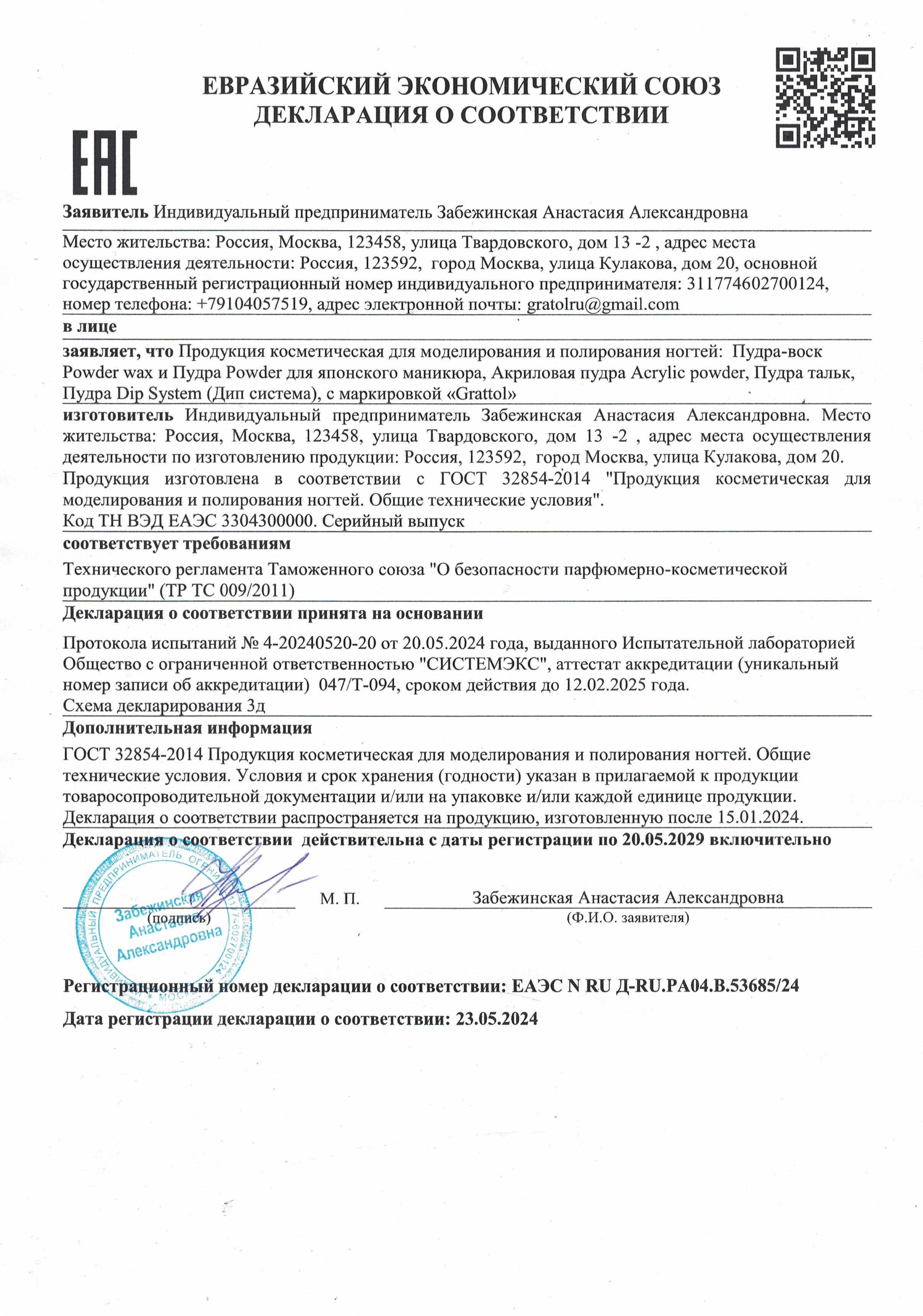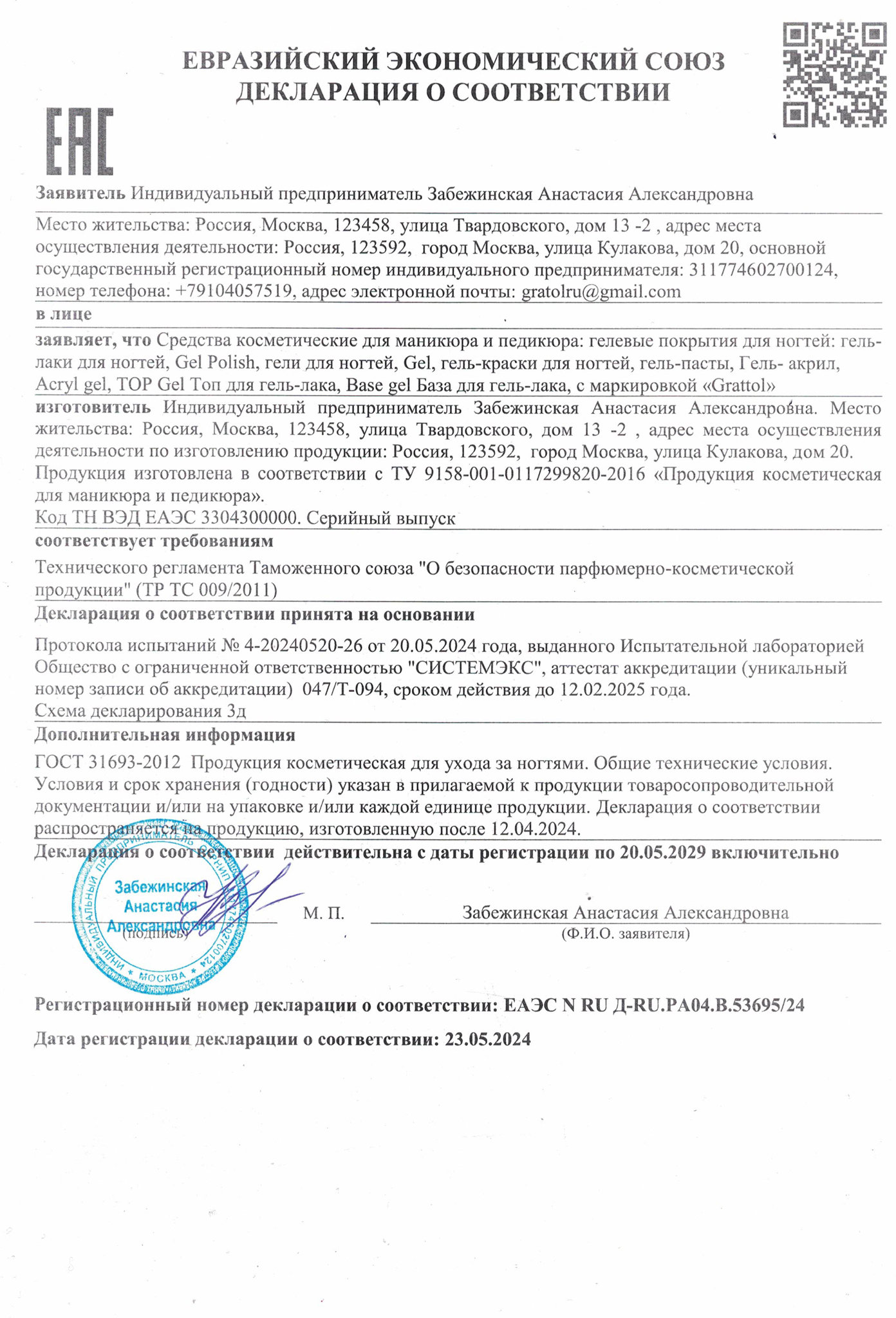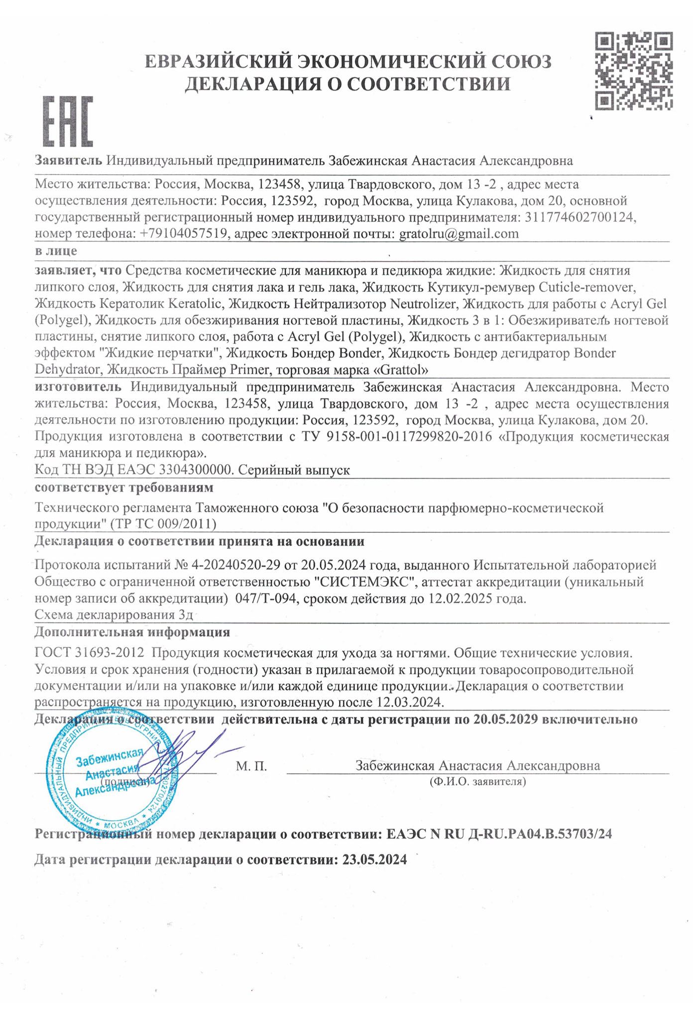| Акрил-гель | ЕАЭС N RU Д-RU.РА04.В.53695/24 | 20.05.2029 |