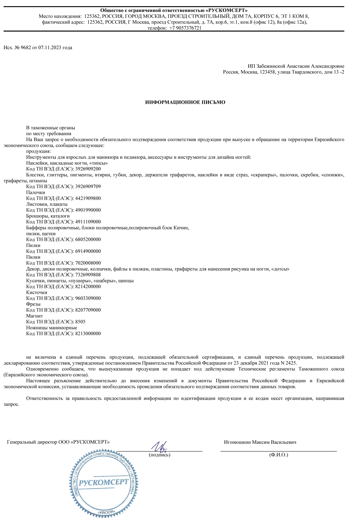 | Топ для гель-лака | ЕАЭС N RU Д-RU.РА04.В.53695/24 | 20.05.2029 |